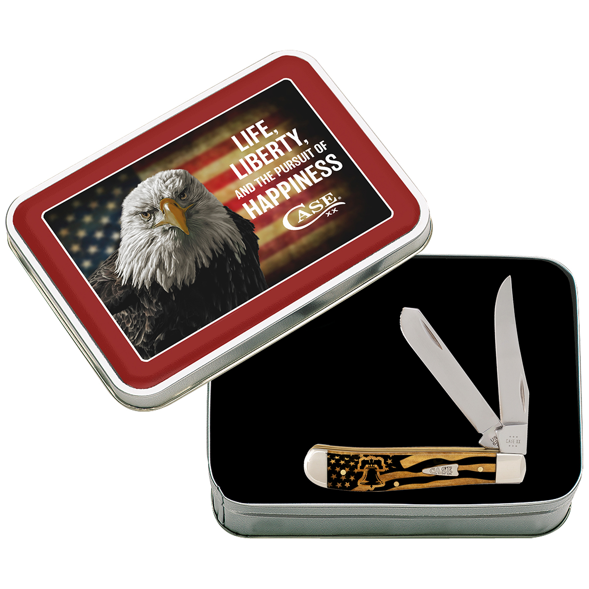 The keepsake tin enhances the presentation with bold, inspiring artwork. Its lid showcases a powerful image of a bald eagle against a flowing American flag backdrop, accompanied by the iconic phrase “Life, Liberty, and the pursuit of happiness,” with the Case logo displayed beneath the text. This set makes a thoughtful gift and a standout addition for collectors who appreciate symbolic artistry and timeless Case craftsmanship.